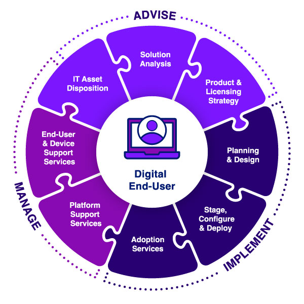 From hybrid work strategies to licensing solutions, we align collaboration tools, endpoint management, security, and lifecycle services with the specific needs of your workforce, unlocking the full value of your technology investments and preparing your business for what’s next.